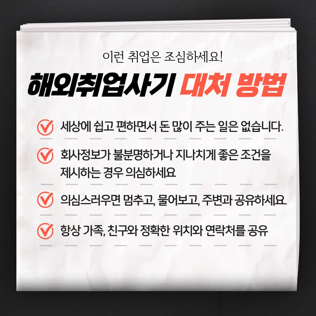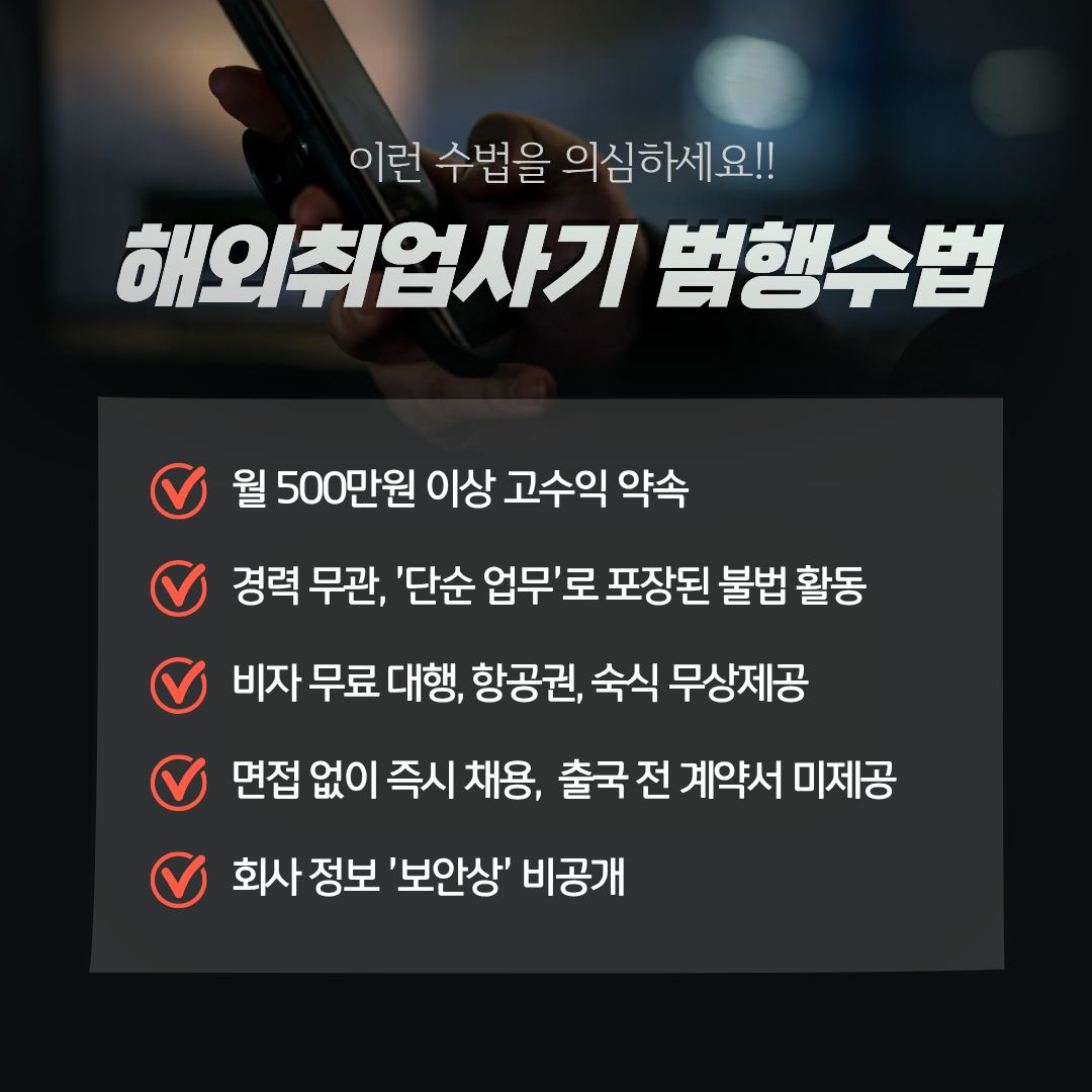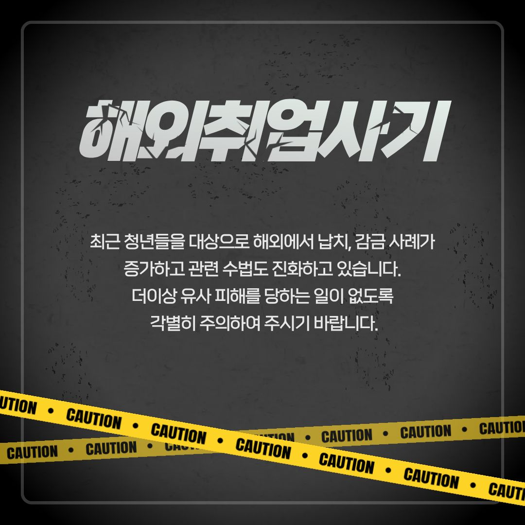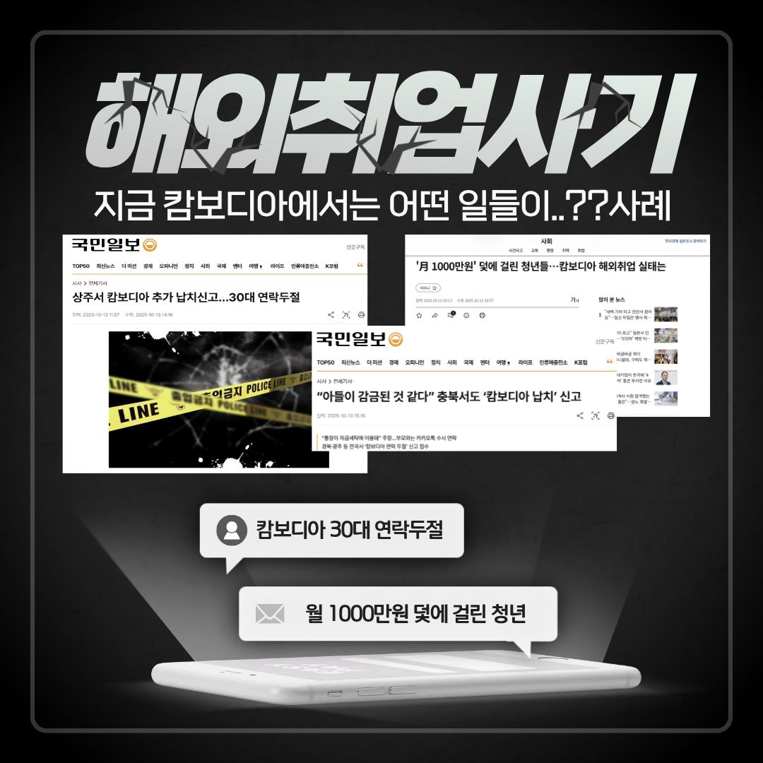 학생공지 학생공지 일반공지 장학/학자금 공지 감염병안내 공모/모집/시험 도서관 생활관 기부금공개 업무추진비공개 보육교원연수원 기타공고 충청대학교_대표-학생공지(대표_충청마당_공지사항_학생공지) 상세보기 - 제목, 내용, 파일, 작성자, 조회수, 작성일, 학과공지, 주소링크 정보 제공 [노란화분] 해외 취업 사기 범죄 예방 안내 작성자 : 이정민 작성일 : 2025-10-23 조회 : 45 최근 해외 취업 사기 범죄가 심각합니다. 주의하세요. 파일 png 문서 캄보디아 범죄 예방1.png png 문서 캄보디아 범죄예방 2.png png 문서 캄보디아 범죄예방 3.png png 문서 캄보디아 범죄 예방 4.png png 문서 캄보디아 범죄예방 5.png 주소링크 목록 게시물삭제 광고 반복작성 욕설 본인삭제 게시물삭제 다음글 【취업허브센터】 2025년 졸업특화프로그램 『인적성 시험 꿀팁 대방출 프로젝트』 운영 안내