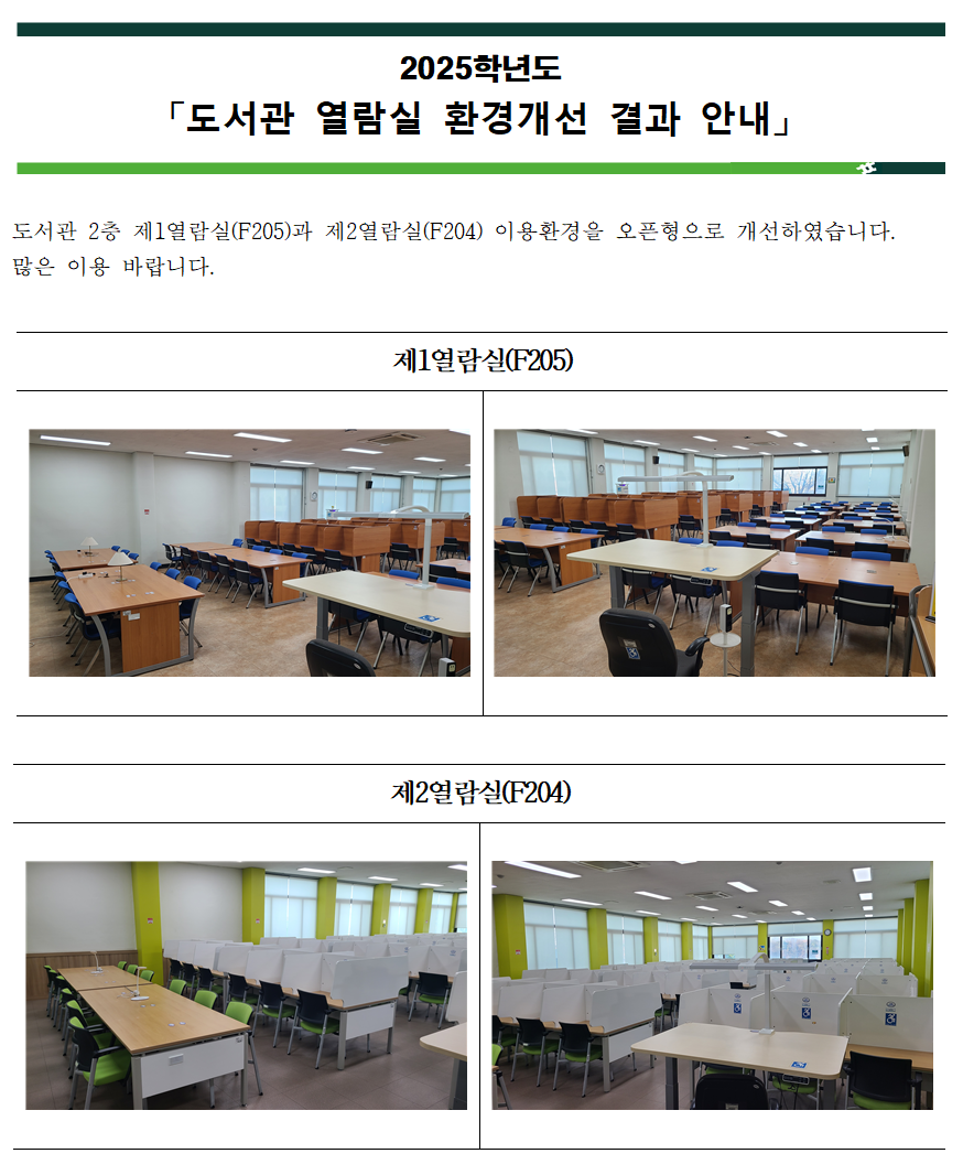 학생공지 학생공지 일반공지 장학/학자금 공지 감염병안내 공모/모집/시험 도서관 생활관 기부금공개 업무추진비공개 보육교원연수원 기타공고 충청대학교_대표-학생공지(대표_충청마당_공지사항_학생공지) 상세보기 - 제목, 내용, 파일, 작성자, 조회수, 작성일, 학과공지, 주소링크 정보 제공 【도서관】 열람실 환경개선 안내 작성자 : 강희진 작성일 : 2025-11-26 조회 : 329 열람실 환경개선 안내 파일 png 문서 2025 도서관 열람실 환경개선 안내_20251125.png 주소링크 https://clis.ok.ac.kr/#/bbs/notice/1400 목록 게시물삭제 광고 반복작성 욕설 본인삭제 게시물삭제 다음글 【도서관】 2025년 전자자널 DBpia 온라인 실시간 이용 교육 안내(6차)