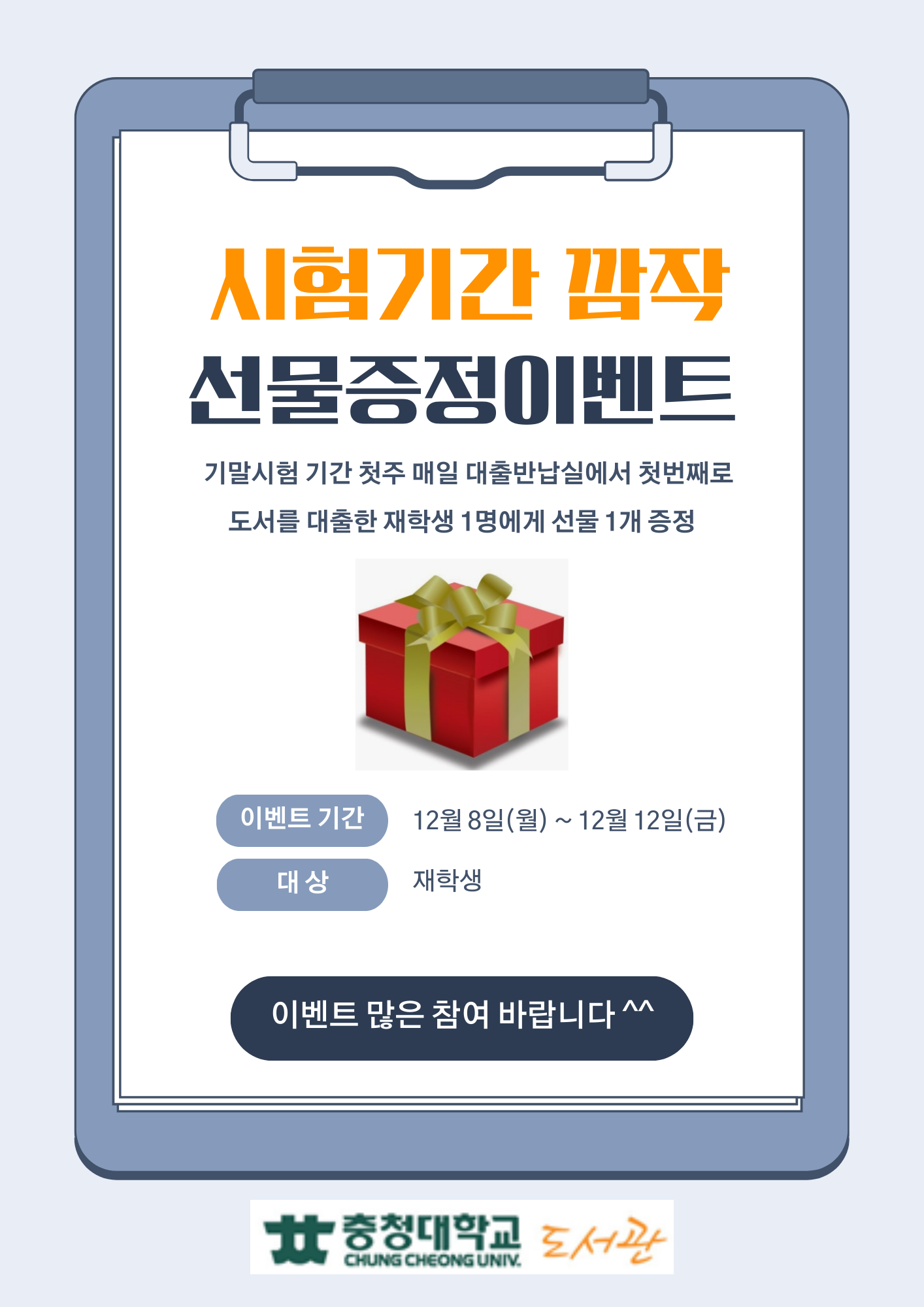 학생공지 학생공지 일반공지 장학/학자금 공지 감염병안내 공모/모집/시험 도서관 생활관 기부금공개 업무추진비공개 보육교원연수원 기타공고 충청대학교_대표-학생공지(대표_충청마당_공지사항_학생공지) 상세보기 - 제목, 내용, 파일, 작성자, 조회수, 작성일, 학과공지, 주소링크 정보 제공 【도서관】 시험기간 깜작 선물증정 이벤트 안내 작성자 : 강희진 작성일 : 2025-12-01 조회 : 148 시험기간 깜작 선물증정 이벤트 안내 파일 png 문서 2025 시험기간 깜짝 선물증정 이벤트 안내_20251201.png 주소링크 도서관 시험기간 깜작 선물증정 이벤트 안내 목록 게시물삭제 광고 반복작성 욕설 본인삭제 게시물삭제 이전글 [모집]2026학년도 총학생회 핵심 국원 모집 다음글 【도서관】 열람실 환경개선 안내