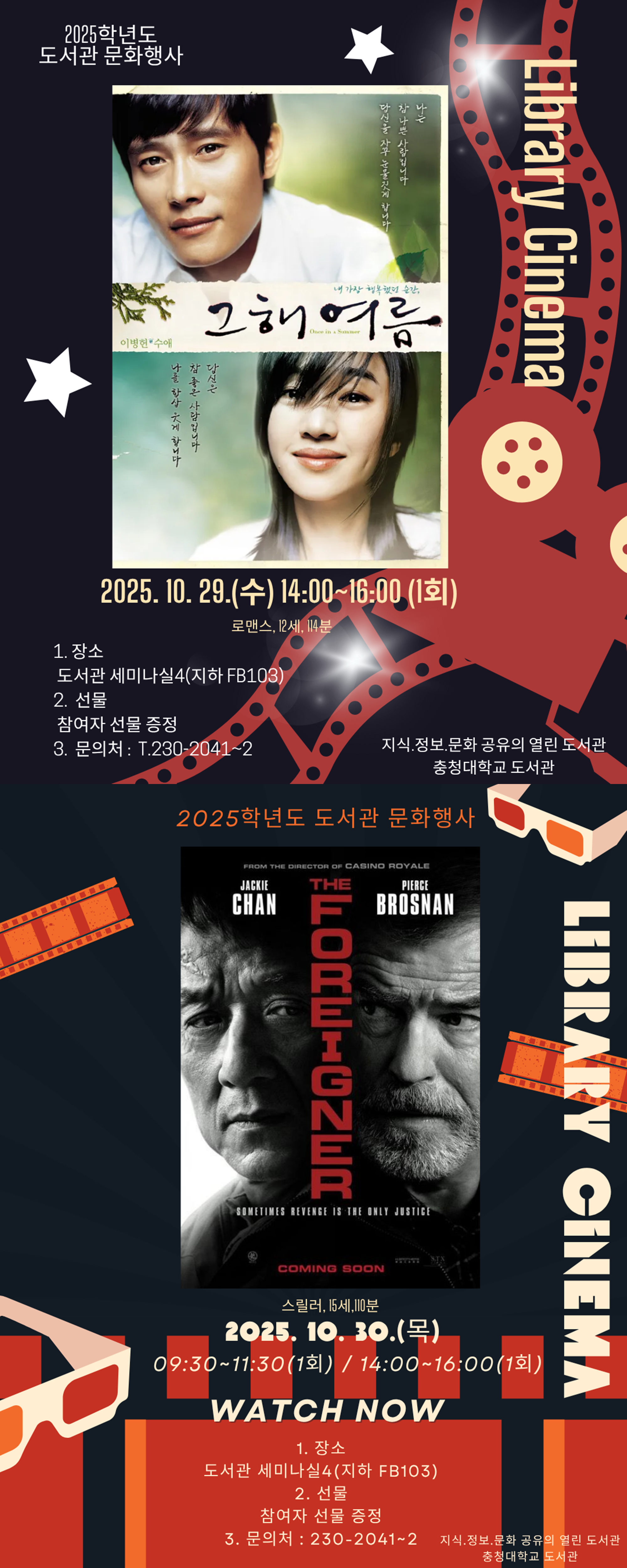 도서관에서는 다음과 같이 2025년 4회 "Library Cinema(도서관 영화상영회)"를 개최합니다.