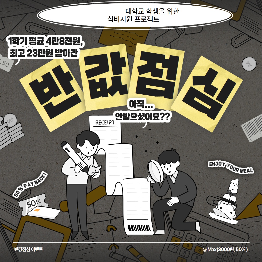 대학 생활에 필요한 모든 서비스를 하나로 통합한 플랫폼입니다. 앞으로 충청대학교의 수업 및 교내 서비스는 ‘헤이영 캠퍼스’ 앱을 통해 더 편리하게 이용할 수 있습니다. ① 반값점심 이벤트 교내·외 지정 가맹점에서 사용 금액의 50% 캐시백 (최대 3,000원) 매일 참여 가능합니다! ② 푸드트럭 무료 간식 이벤트 헤이영 앱을 보여주면 무료 간식 증정! - 일시: 2025년 10월 17일(금) 오전 10시~ - 장소: P동 교수연구동 입구 |