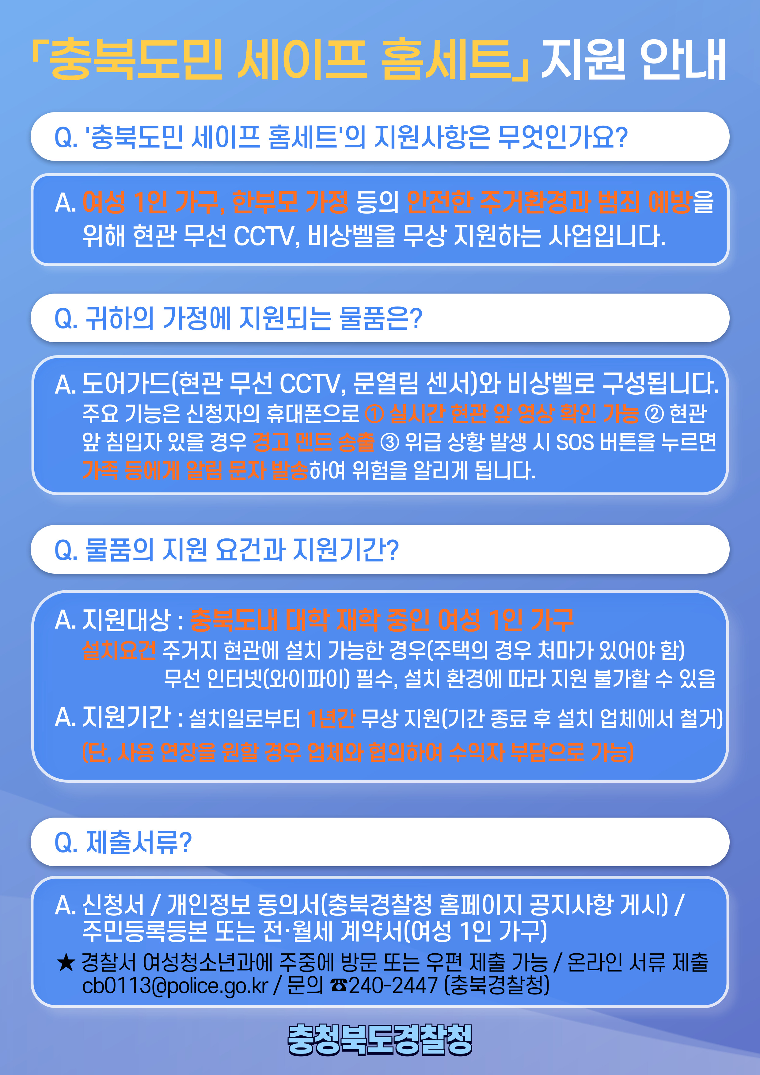 일반공지 학생공지 일반공지 장학/학자금 공지 감염병안내 공모/모집/시험 도서관 생활관 기부금공개 업무추진비공개 보육교원연수원 기타공고 충청대학교_대표-학생공지(대표_충청마당_공지사항_학생공지) 상세보기 - 제목, 내용, 파일, 작성자, 조회수, 작성일, 학과공지, 주소링크 정보 제공 [인권센터] 대학생 여성 1인 가구 대상 보안장비 무상지원 안내 작성자 : 이정민 작성일 : 2025-10-24 조회 : 43 도내 대학 재학 중인 여성 1인 가구 대상, 세이프안심홈세트 지원 안내입니다. 파일 jpg 문서 안심장비 세이프 홈세트 지원 안내문.jpg hwp 문서 서비스 이용 신청서 및 개인정보 수집이용 동의서(공통 ).hwp 주소링크 목록 게시물삭제 광고 반복작성 욕설 본인삭제 게시물삭제 이전글 【취업허브센터】 2025 모의면접 경진대회(11.19.(수)) 행사 안내 다음글 [노란화분] 해외 취업 사기 범죄 예방 안내